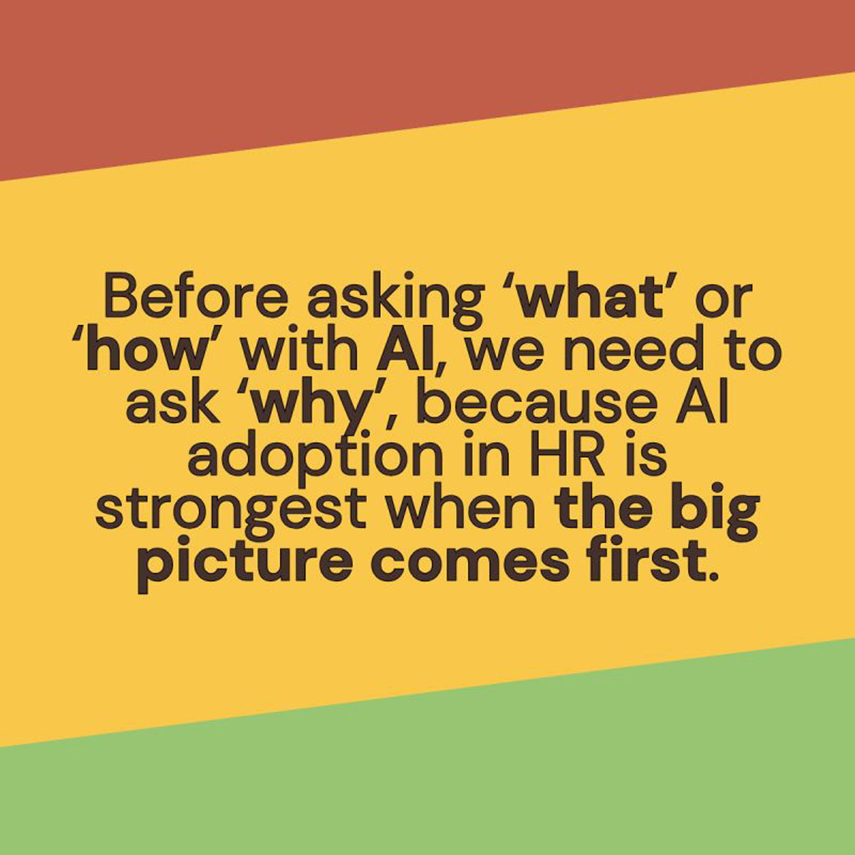 議論は ”どのツールを使うべきか” ”どう実装するか” を超えた次元へ進む必要があります。 ”なぜ” ”何のために”という問いも不可欠です。人事と職場におけるAIの役割に関する明確なビジョンが最優先されるべきです。具体的な製品の採用を決定する前に、戦略、責任分担、そして人間とAIの協働形態を定義しなければなりません。