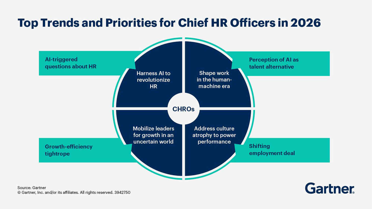 人事およびCHROの優先事項に関する最近のトレンドは、明確な変化を示しています。AIはもはや人事の副次的な話題ではありません。AIは業務モデル、意思決定、そして人的努力の最適な活用方法に変化をもたらしつつあります。同時に、リーダーには人間と機械が共存する環境における業務設計の再考、不確実性が常態化する中での変革推進方法、そして理念や価値観の表明ではなく、日常業務に文化がどのように反映されるべきかについての、新たな視点が求められています。
